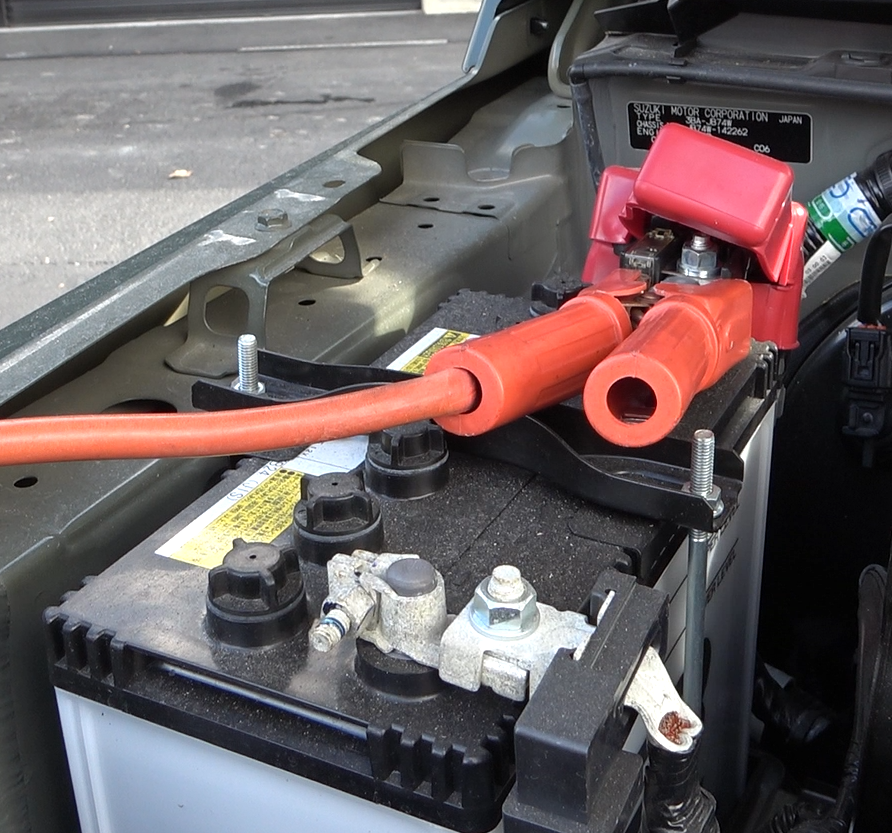 - 故障車のエンジンの金属部分(未塗装部)につなぐ