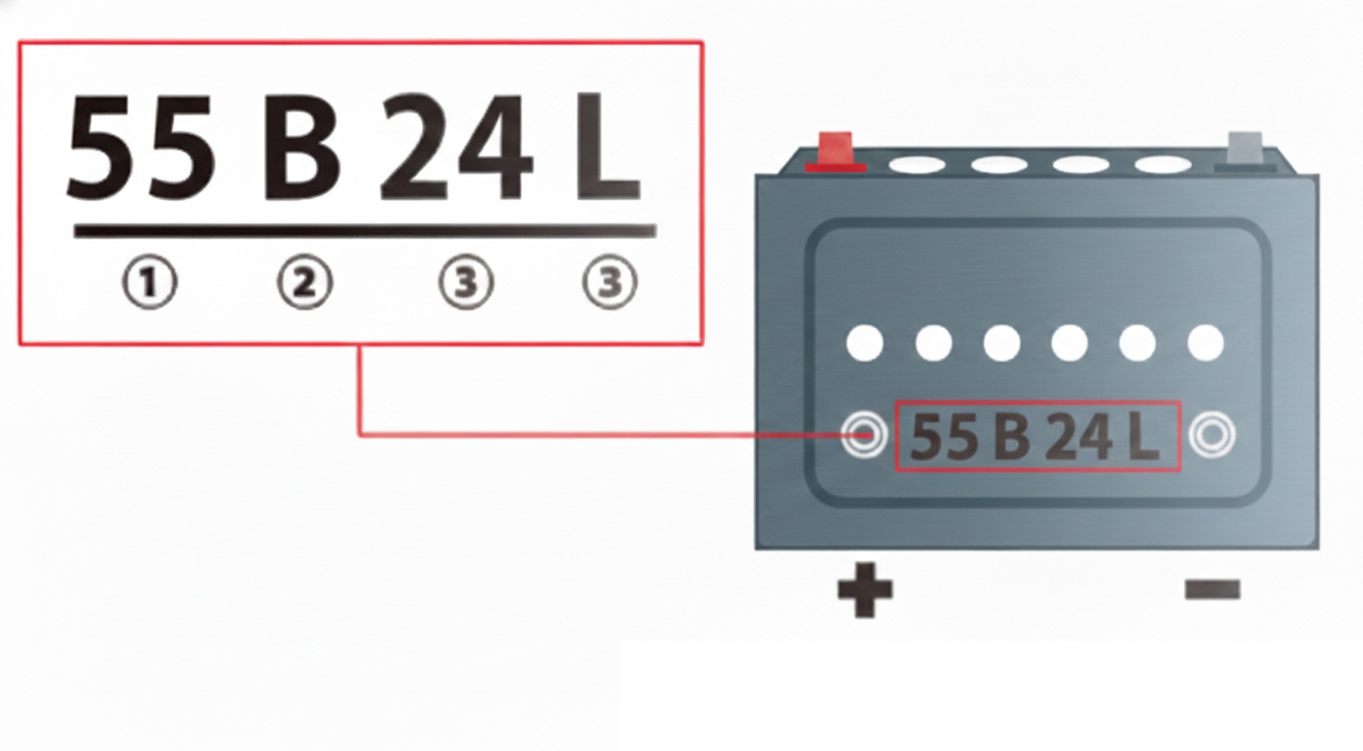 - B(サイズ記号): バッテリーの短辺と高さの規格です。(JIS規格でA~Hまで)